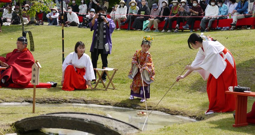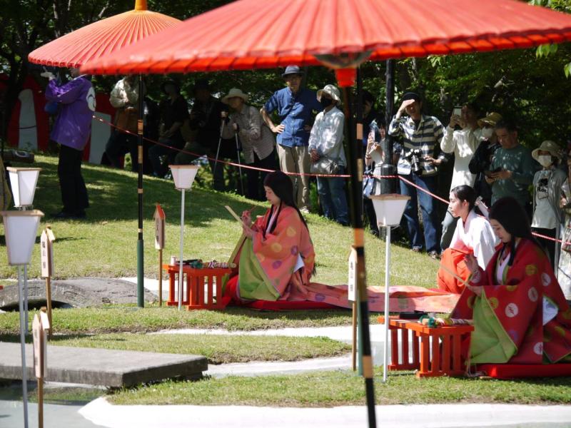 曲水の宴【きょくすいのうたげ<えん>】とは、水の流れのある庭園などでその流れのふちに出席者が座り、流れてくる杯が自分の前を通り過ぎるまでに詩歌を読み、出来なければ罰として盃の酒を飲むという行事です。略して曲水、曲宴ともいわれています。